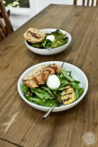I had a friend over for lunch and we hard-boiled some eggs, toasted up some cinnamon swirl bread and used up leftover grilled veggies on our salads.