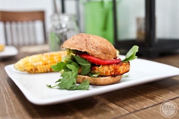 BBQ marinated tofu with pickled cucumbers on GH buns with corn on the cob.