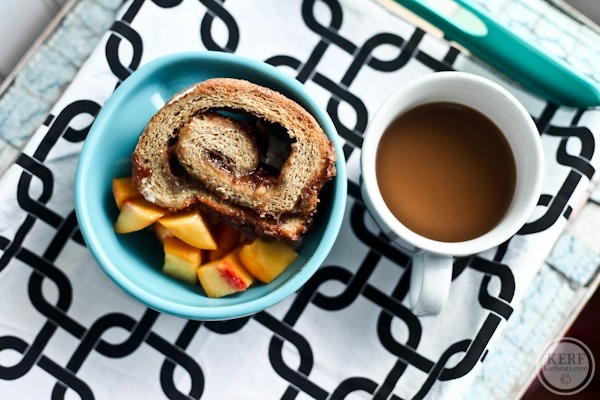 And finally, plain yogurt, peach and a slice of cinnamon toast on top. No plate necessary.