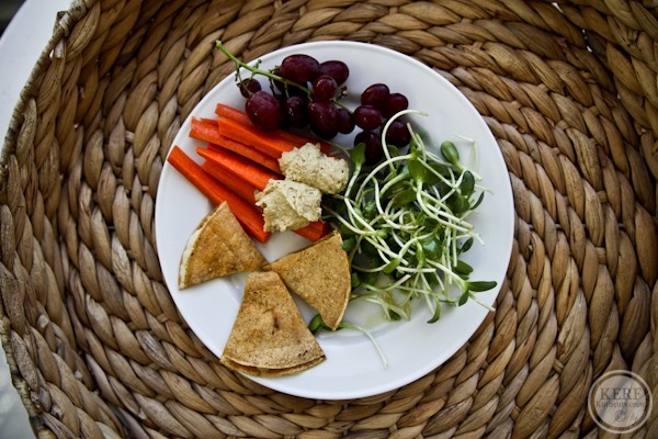 Another day I had a mixed plate – a mini quesadilla, carrots and hummus, grapes and sprouts drizzled in EVOO and honey.