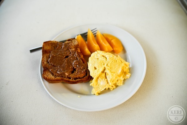 Next up: pumpkin swirl toast with almond butter, eggs, and some canned peaches I bought at the market at the end of the summer – just stretching the peach love out a bit!