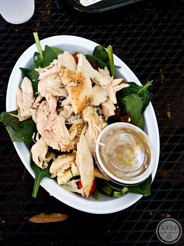 I took Mazen out to lunch after preschool, and we went to Eppie’s. Instead of the veg plate, I got the Santa Monica salad topped with chicken. Under all that chicken is goat cheese, dates, corn and tomatoes. The champagne dressing is the best!
