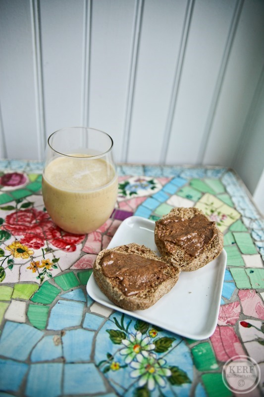 And finally, a pumpkin pie smoothie (Mazen loved this!) with toasted honey wheat roll topped with the usual. My smoothie had milk, pumpkin, a little yogurt for extra protein, a few pinches of pumpkin pie spice and a handful of raw oats.