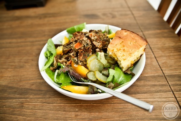 This strange looking pile over a salad is a No Bull Burger that I cut up for Mazen and then he rejected. I had to take one for the team : ) It’s served with greens, yellow bell pepper, pickles, and half a slice of Eppie’s cornbread! Lemony O&Co drizzled on top. <– Love that stuff and perfect timing: they are having a big sale this weekend with 25% off if you use the coupon FRIENDS!