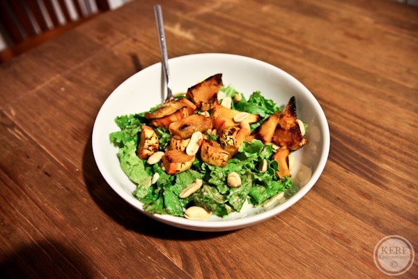 This night I was headed out with girlfriends, so I made a simple salad knowing I might have a little more to snack on. It was made with geens, peanuts, cheese, and roasted squash and served in a homemade dressing. Consumed after dark!