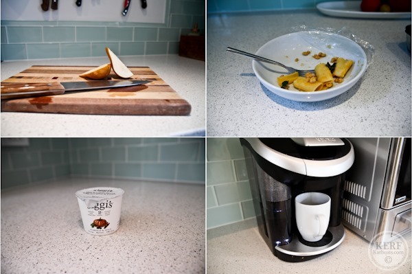 This lunch was a quickie when my parents arrived. I made a salmon salad with capers, yogurt, mustard and curry powder. I used Kashi cracker for dipping and had a pear on the side.
