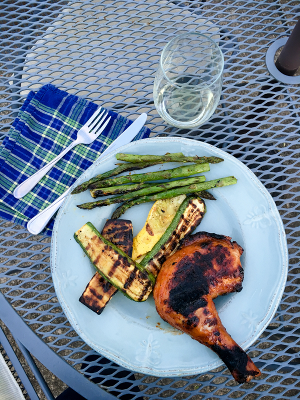 Dinner #2 at a friend’s house – BBQ chicken and grilled veggies. So glad grilling season is back! The chicken was covered in Bone Suckin’ Sauce – the best!