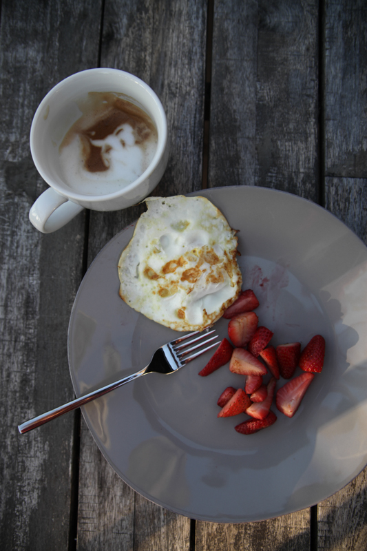 Breakfast #3 is a fried egg, lots of strawberries (that I have to microwave because of my sensitive teeth!) and a foamy cappuccino.