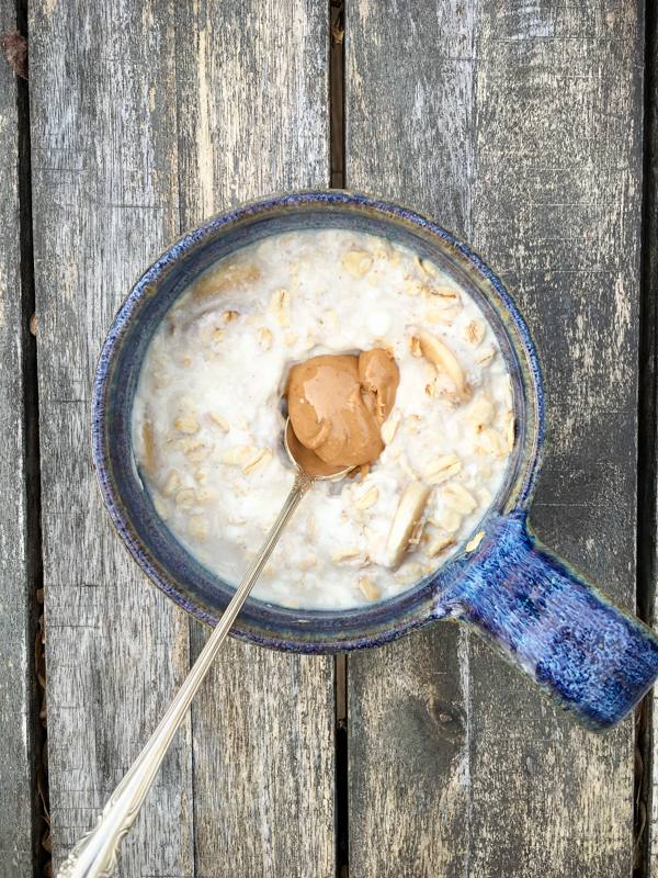 Breakfast #2 to share is overnight oats. I’m into simple toppings these days. A scoop of Wild Friends peanut butter on top is all for today! Bananas are mixed inside along with oats, milk, yogurt, cinnamon, salt and chia seeds.