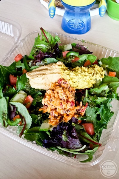 Lunch with a blog reader at the bakery! Matt made me a salad surprise with a few of our spreads over lots of greens and pesto. A piece of chocolate bliss cookie for dessert ; )
