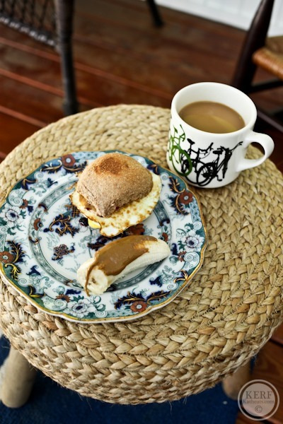 An egg sandwich on Honey Whole Wheat roll with half a sunbuttered banana