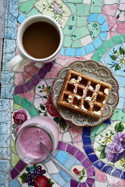 A frozen waffle (Julians brand) covered in butter and syrup with a small smoothie on the side!