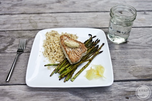 Next up we had seared tuna steaks with grilled zucchini and a millet-quinoa blend. The “sauce” on top was a wasabi mayo Matt whipped together, and we found our jar of pickled ginger that we so rarely use in the fridge!