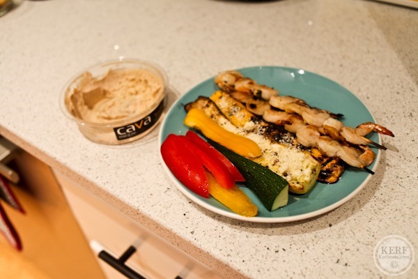 And lastly, here’s my post-soccer late-night dinner of leftover shrimp kebobs, leftover squash and some raw veggies dipped in Cava hummus.