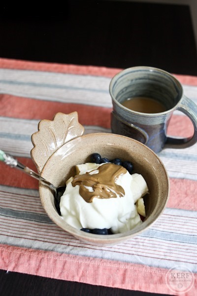 Cool yogurt bowls. With blueberries, banana and drippy sunbutter on top!