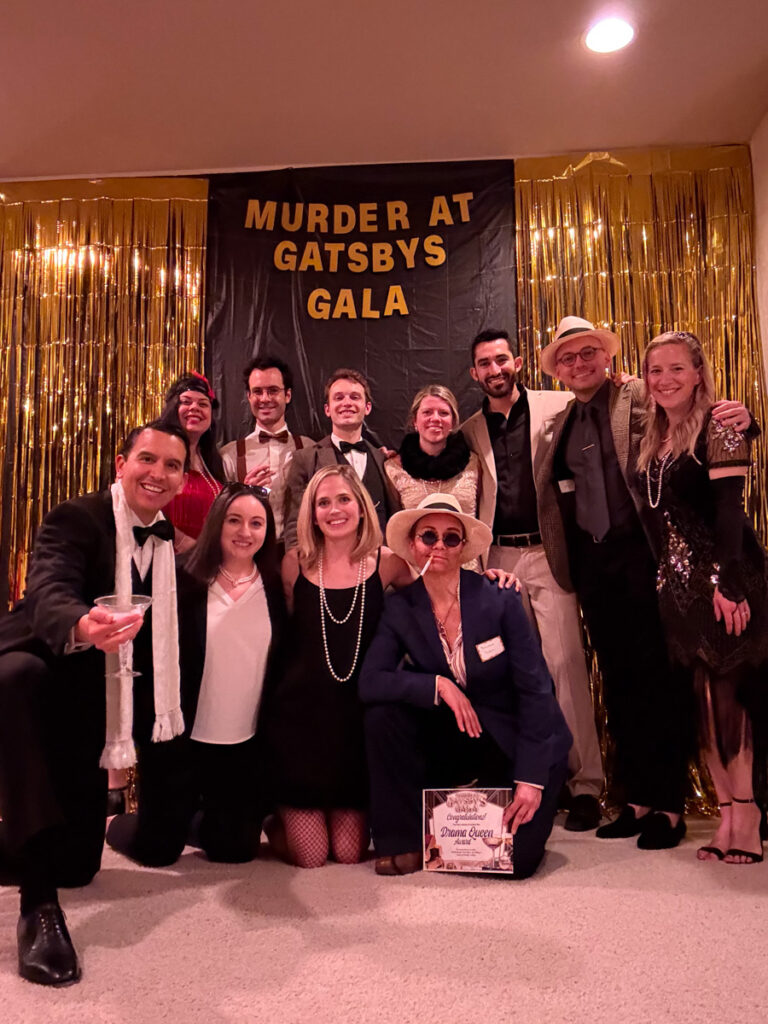 I hadn’t done a murder mystery before, but this is the one we did (after voting on the theme!) Everything in the kit is planned out for you so that even the hosts can participate. Thanks to Chava and Ivy for organizing! The decorations were perfect.