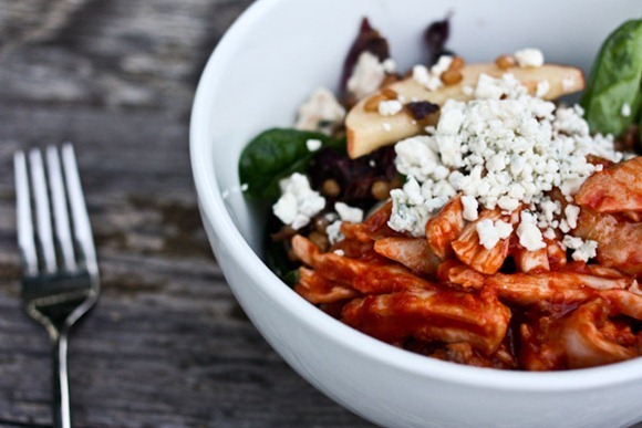 Radicchio + Wheatberry Salad reheated with BBQ chicken and bleu cheese.