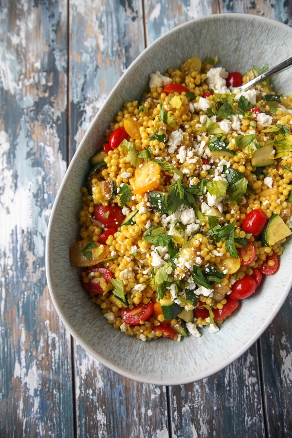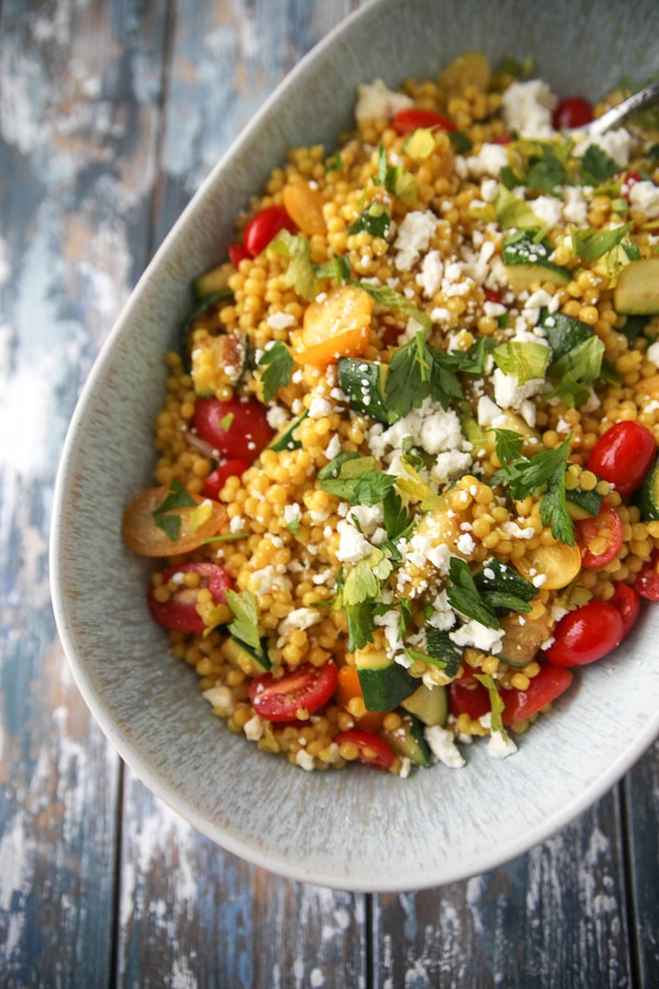 This simple pearl couscous salad features lemon zest, feta cheese, parsley, and vegetables and makes a delicious side dish or a main course with grilled shrimp or chicken on top.