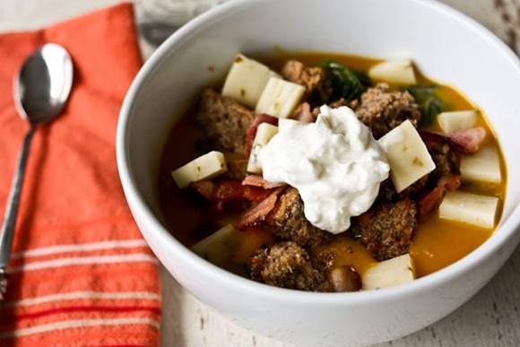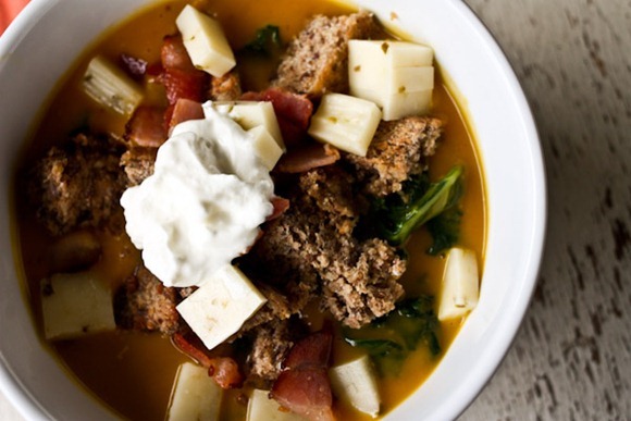 - Garnish with croutons, bacon, cheese and a dollop of yogurt.