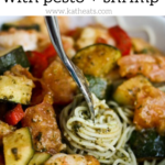 Oh my gosh!! That pasta looks SOOOOO good!!! Angel hair, shrimp, pesto, and veggies – does it get any better than that?