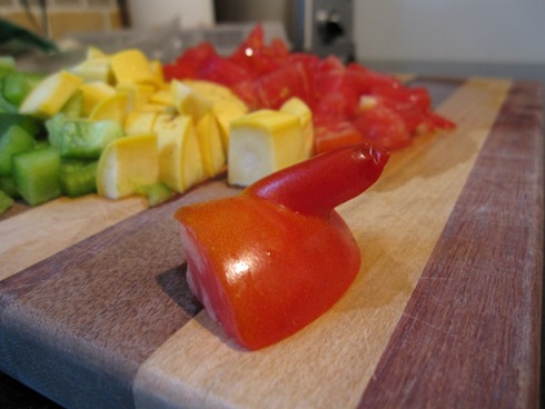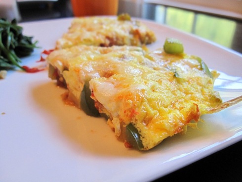 I made a frittata with 1/2 a green pepper, a summer squash and 2 tomatoes, plus 4 eggs, some Creole seasoning, 2 slices of jalapeno cheese and some grated parmesan. Cooked the veggies in a skillet till they were soft, added the eggs, cooked for 2-3 minutes, added cheese, broiled for 2 more.