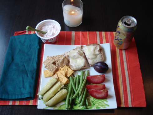 A tasting plate of pickle, greens beans (surprisingly good raw!), dragon plum sliced (I ate 2 as I was cutting it), another strange plum with a green interior, and a mix of Kashi Cheddar and Honey Sesame. I like the cheddar, but not as much as the grainier ones.