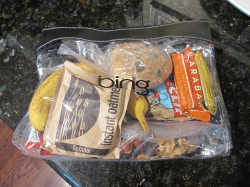Iāve packed a huge assortment of bars, oatmeal, fruit, nut mix, and a Dakota bun for breakfasts and snacks