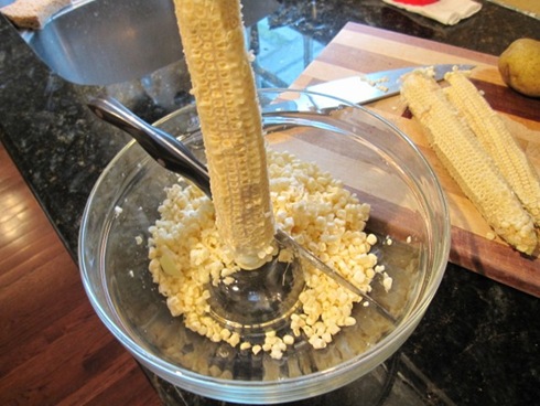 I used Rachel Rayās double bowl trick to cut the corn off the cob (just put a small bowl upsidedown in a big one to contain the kernels)