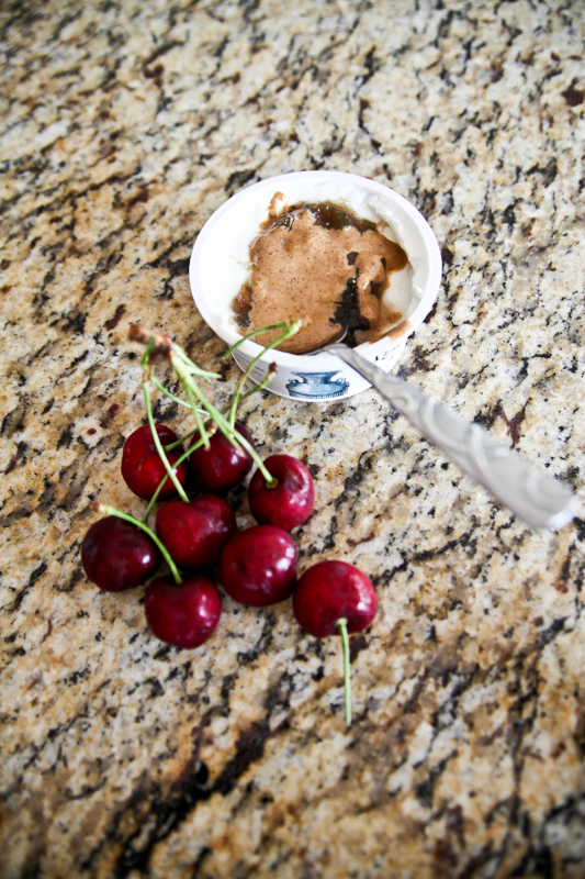 Breakfast was a Siggi’s plain yogurt spiced with almond butter and rhubarb jam plus a few handfuls of cherries.
