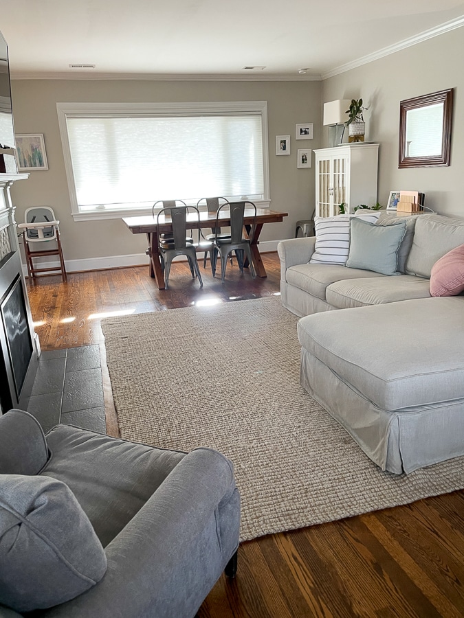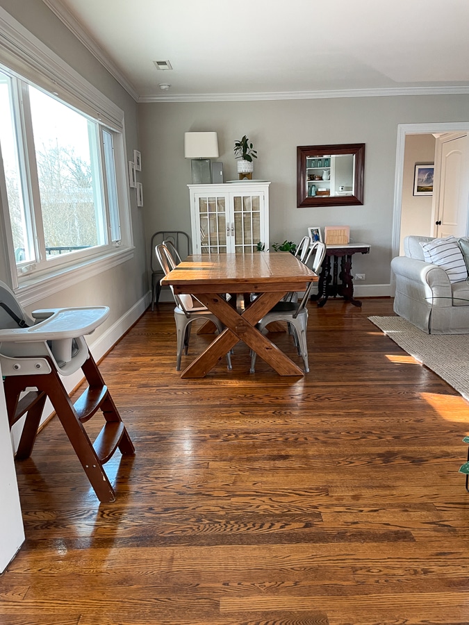 I went to Pinterest and searched for “dining rooms” to see if going rug-less was allowed. Ha! It seemed about half of dining rooms had pretty rugs and half did not. Since our dining room is part of our living room, I always felt like the rugs competed with one another. Now it feels more open to me!