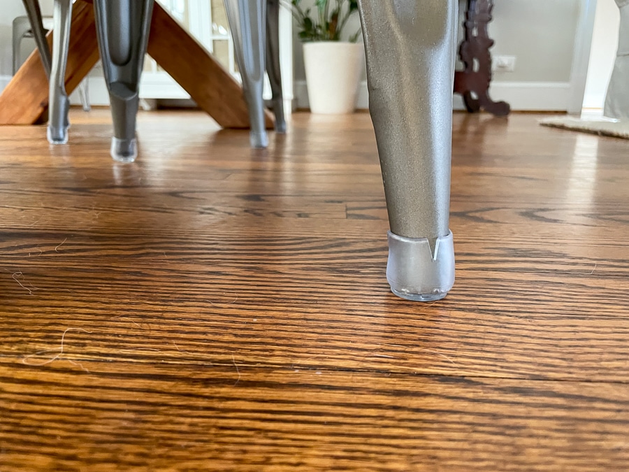OH – and to protect the floor I added these little silicone feet to the bottom of the chairs. They fit well and are perfect for avoiding more scraping. These chairs are the Remy chair from Restoration Hardware (I’m not sure they are still available) but I am not totally happy with them six years later because they are dinged in several spots and the rubber feet came off seriously damaging our rug, the floor, and the NEW PORCH FLOOR – ugh! These feet are the perfect solution.