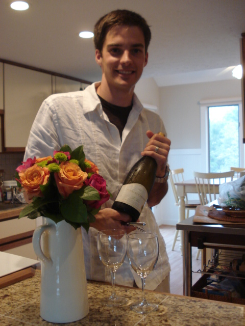 We started with our celebratory bottle of Chardonnay that we brought back from the honeymoon. Here’s the husband with his bouquet uncorking it –