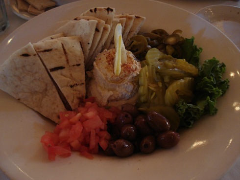 And the hummus platter complete with flatbread (I had about 2/3 of them), delicious hummus (I only ate about 1/3 of it – shared the rest), kalamata olives (had about 7?), pickles, tomatoes and jalapenos (picked at all of these).