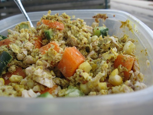 Made with a carrot, a cob of corn cut off, half a cuc, a can of salmon, 2 tsp olive oil mayo, a few blobs of Dean + Deluca mustard, and a tsp of yellow curry powder.