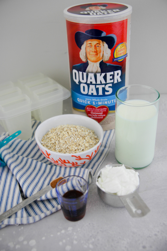To get started, mix together oats, milk, Greek yogurt, cinnamon, vanilla, and maple syrup just like you would for a regular bowl of overnight oats. You can do this right in your blender or in a bowl. Allow to sit and soak for about 10 minutes. This soak time is to ensure the pops fill evenly instead of the oats sinking to the bottom and the milk on top, but you don’t need to soak for a long time like you normally would. You want them to still be pourable.