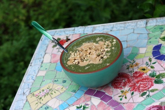 - 2 huge handfuls of packed spinach (I had forgotten how amazing baby spinach is in a smoothie!! So sweet!)