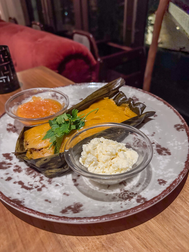 We ordered a tamale to start – a corn tamale with beef, peppers, carrots, capers, Kalamata olives, raisins marinated in rum, wrapped in banana leaves and tomato sauce.