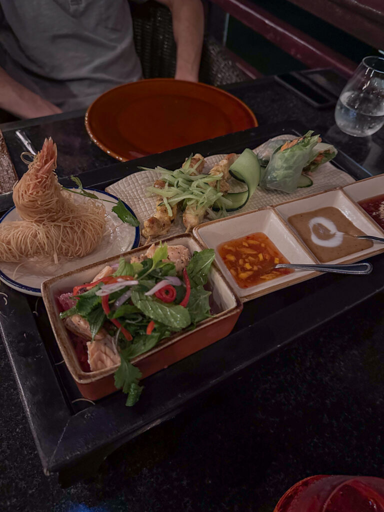 We decided to order the appetizer sampler to share to be able to taste as many dishes as possible (that is always my goal in a restaurant and why I’m a fan of sharing / ordering a bunch of starts vs just getting one entree and calling it a night!) The sampler included chicken satay, noodle wrapped crispy prawn (my favorite!!), grilled salmon salad and spring rolls with a spicy peanut sauce. Everything was delish!