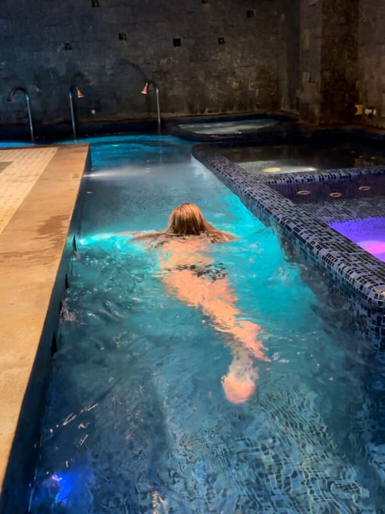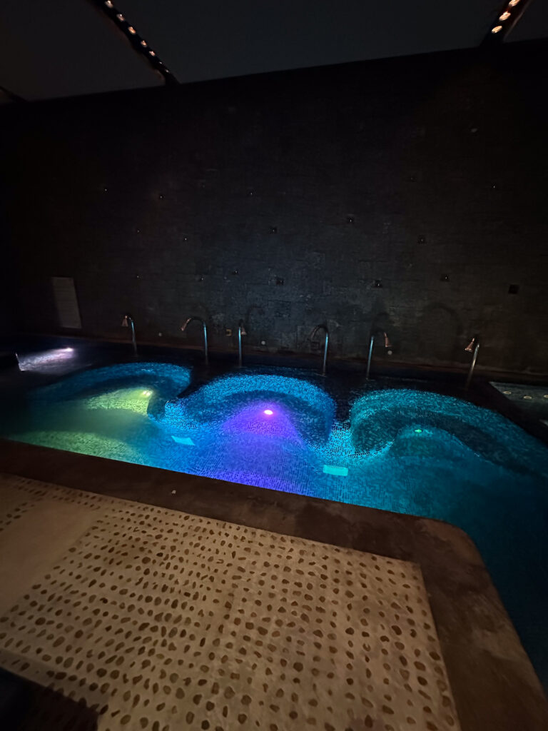 Our final stop was the big room of pools! There were bubble chairs, hot tubs, and waterfall shower heads to drench us. They also included some snacks and towels if you wanted to relax. We took a tour through the stations – the bubble chairs were my favorite because it felt like you were floating, and the bubbles were HUGE in the hot tubs, like lava mountains! Then we filmed some videos.
