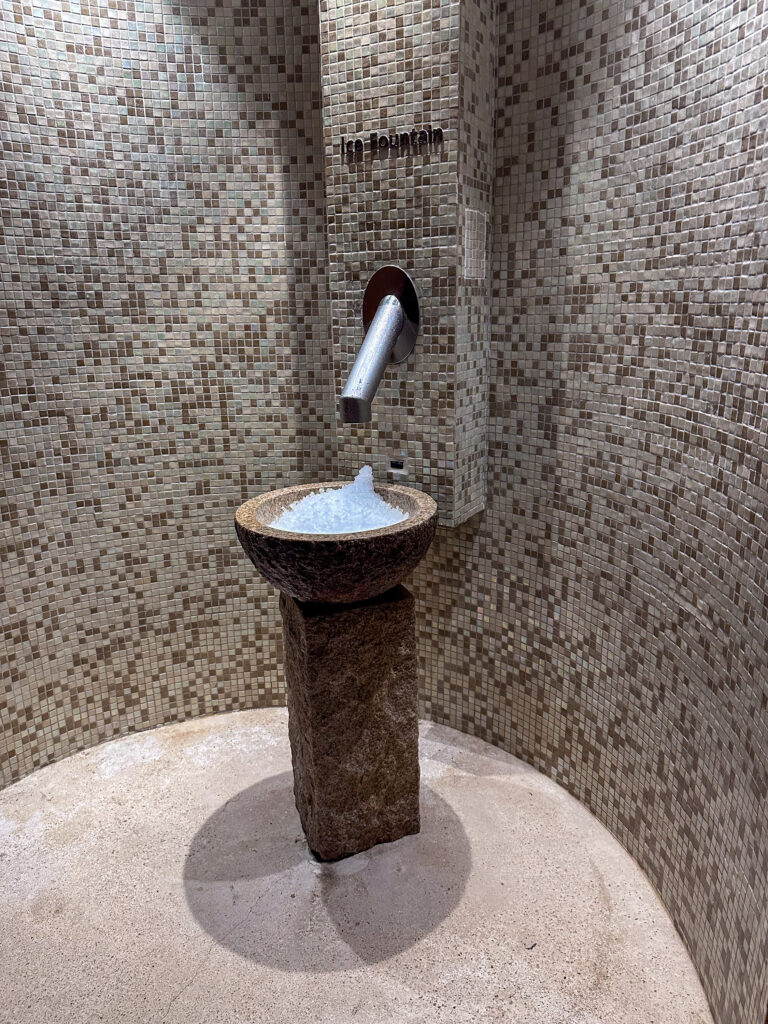 We love saunas, so this one was fun. There were two levels, and the upper level was significantly hotter than the lower. I moved up to the top for 5 minutes and then back down. We were given ice clothes to put on our faces. We only stayed in about 10 minutes but we were SO HOT by the end. Totally dripping in sweat and craving ice. Which was great because the next stop was….