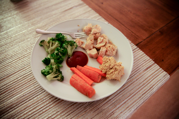 Dinner: Chicken with ketchup, broccoli, carrots and hummus