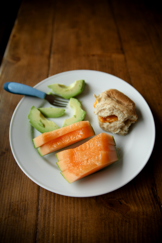 Lunch: Grilled cheese roll, avocado, cantaloupe (his fav!)