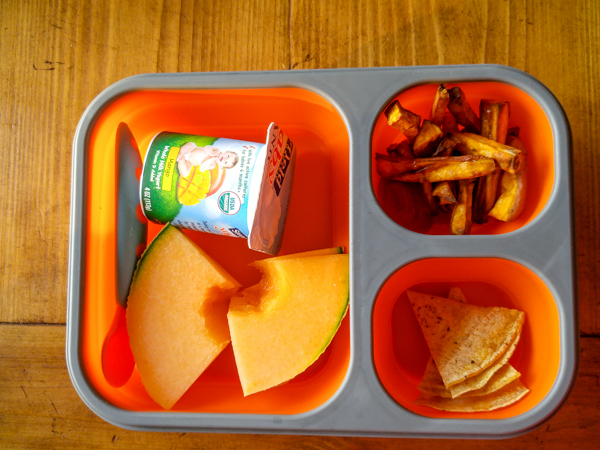 Lunchbox: Yogurt, melon, sweet potato fries, quesadilla