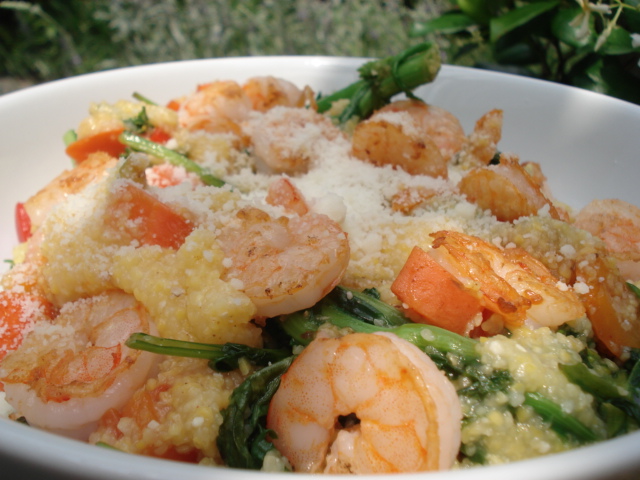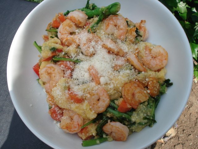 - Add veggies and shrimp to polenta pot and stir together. Pour into bowl and top with shrimp and parmesan.
