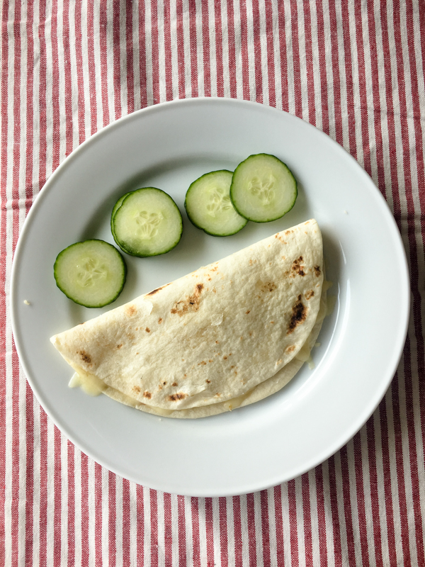 Empty-fridge day meant cucumbers with a cheese and kale quesadilla…