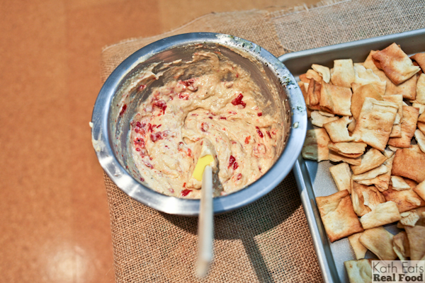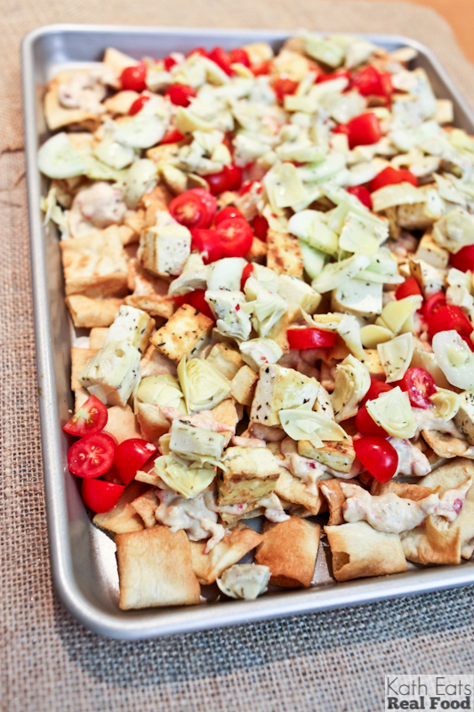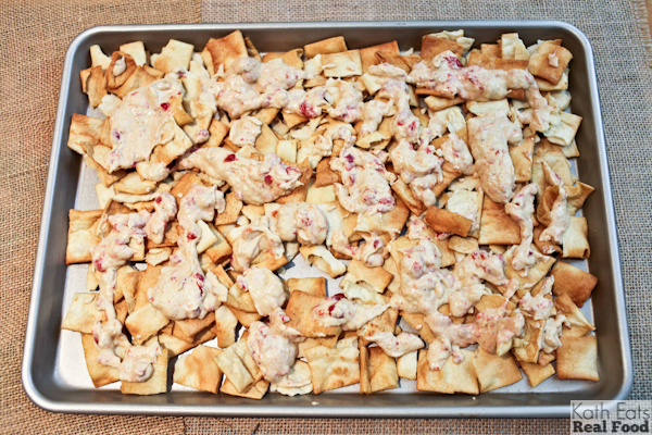 Then the fun happens – spread your pita chips out on a baking sheet (or other big platter!) and spread out your hummus in dollops all around. We used about 3/4 of a bag of Whole Foods’ sea salt pita chips.