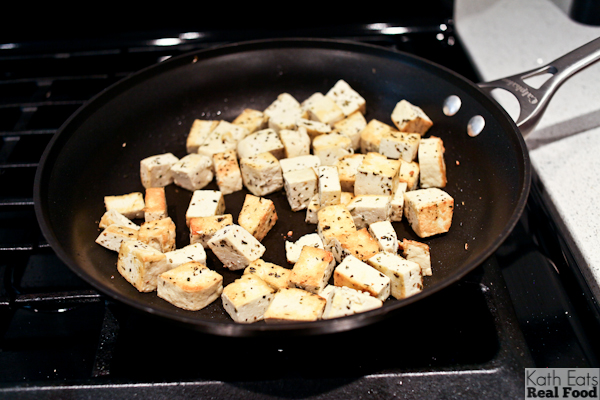 Heat a skillet to medium high and saute tofu for 5-7 minutes, until it is brown on the edges.