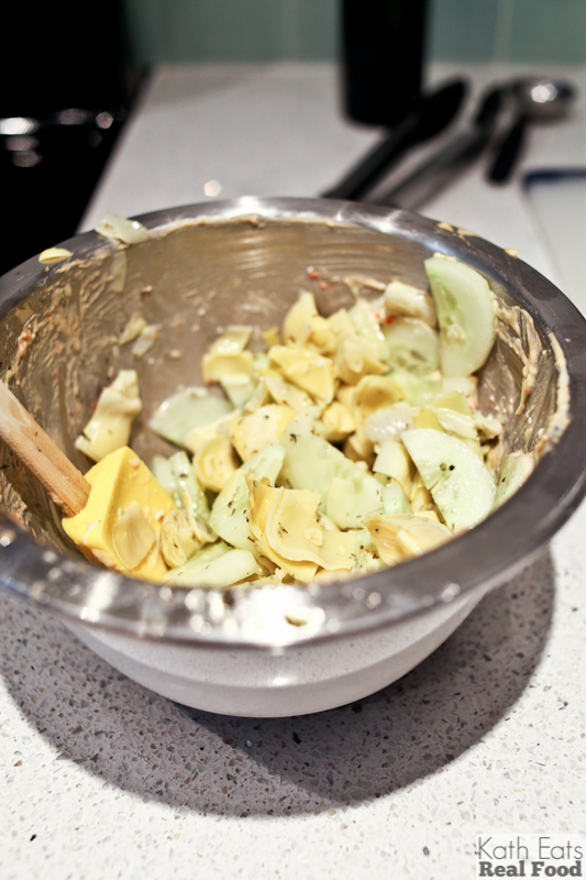 Mix the chopped, drained artichokes and sliced cucumber with a little red wine vinegar and more Italian seasoning.