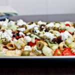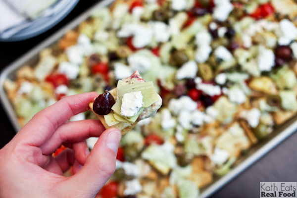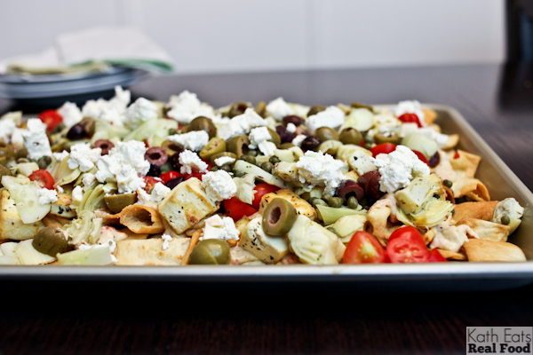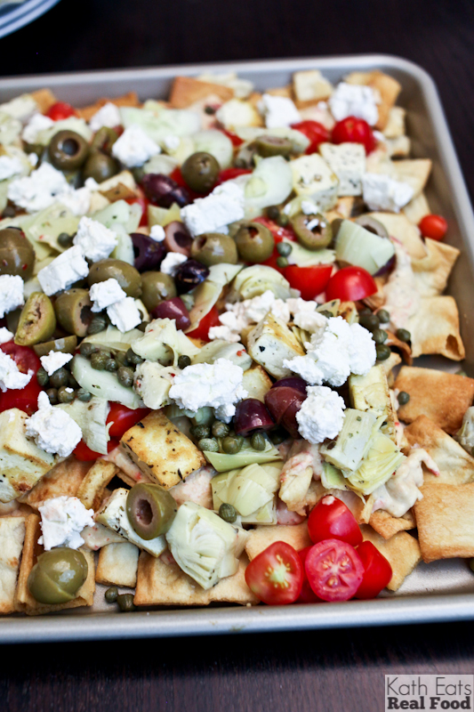 Karen and I had a lot of fun cooking while she stayed with us! We were brainstorming a meal plan one morning and stumbled upon this gorgeous recipe for Mediterranean Nachos. Kristy’s version is vegan and uses tofu as feta cheese and pita as the base. Karen and I adapted the recipe into our own by using both feta and tofu (two is better than one!) and layered a bunch of Mediterranean flavors onto crunchy sea salt pita chips.