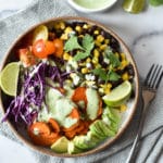 This plant based recipe has a great variety of textures, from the roasted sweet potato to the creamy avocado to the super crunchy purple cabbage. Like most bowls that you assemble, you can add or subtract ingredients that you might have on hand. Store-bought guacamole, queso fresco, sour cream, or salsa would kick up the Mexican-inspired ingredients.